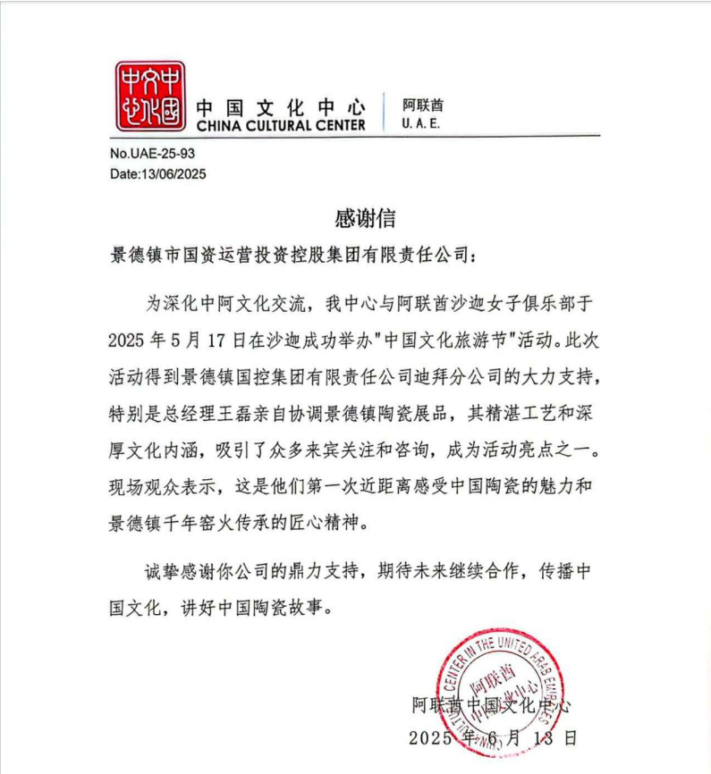 這份來(lái)自阿聯(lián)酋官方的誠摯感謝,不僅是對集團迪拜分公司團隊高效執行和專(zhuān)業(yè)能力的肯定,更是對景德鎮陶瓷文化國際影響力的有力印證,彰顯了我們在推動(dòng)中國文化“走出去”、促進(jìn)國際文化交流合作方面的積極作為。