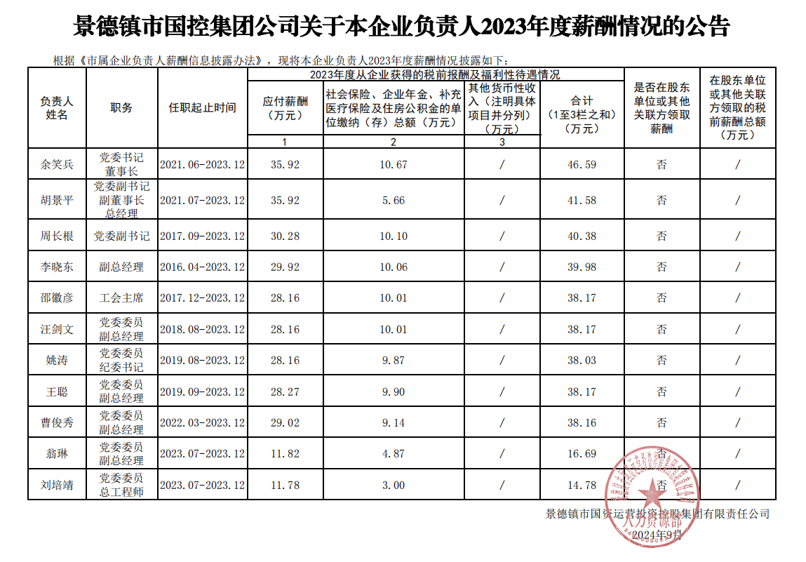 景德鎮市國控集團公司關(guān)于本企業(yè)負責人2023年度薪酬情況的公告